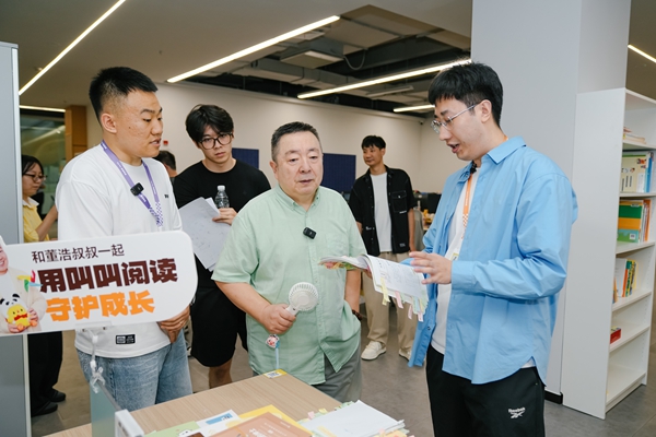 一扎进工区,董浩叔叔首先受到了来自内容研究团队的热烈欢迎。这里就是叫叫每年1000多集、2万多分钟“有趣有效”的数字内容,以及在全球范围内发行量已超过2000万册的童书绘本的起源之地。董浩叔叔饶有兴致地听叫叫阅读创始人、主编甘薇和叫叫内容中心负责人刘星宇介绍了叫叫如何“站在孩子的高度”,结合对各年龄段孩子认知规律的深刻洞察,将枯燥的知识点转化为让孩子愿意主动靠近的趣味互动内容。